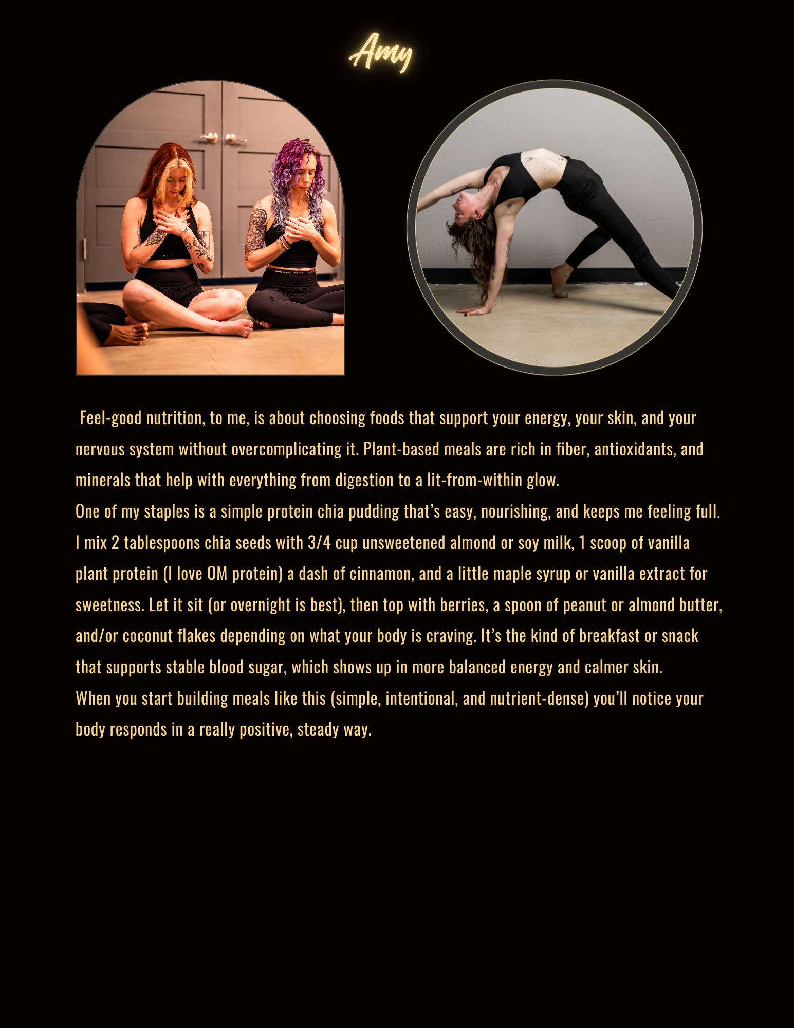 Amy Feel-good nutrition, to me, is about choosing foods that support your energy, your skin, and your nervous system without overcomplicating it. Plant-based meals are rich in fiber, antioxidants, and minerals that help with everything from digestion to a lit-from-within glow. One of my staples is a simple protein chia pudding that’s easy, nourishing, and keeps me feeling full. I mix 2 tablespoons chia seeds with 3/4 cup unsweetened almond or soy milk, 1 scoop of vanilla plant protein (I love OM protein) a dash of cinnamon, and a little maple syrup or vanilla extract for sweetness. Let it sit (or overnight is best), then top with berries, a spoon of peanut or almond butter, and/or coconut flakes depending on what your body is craving. It’s the kind of breakfast or snack that supports stable blood sugar, which shows up in more balanced energy and calmer skin. When you start building meals like this (simple, intentional, and nutrient-dense) you’ll notice your body responds in a really positive, steady way.