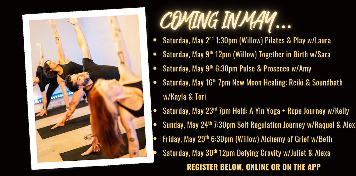 Coming in May... Saturday, May 2nd 1:30pm (Willow) Pilates & Play w/Laura Saturday, May 9th 12pm (Willow) Together in Birth w/Sara Saturday, May 9th 6:30pm Pulse & Prosecco w/Amy Saturday, May 16th 7pm New Moon Healing: Reiki & Soundbath w/Kayla & Tori Saturday, May 23rd 7pm Held: A Yin Yoga + Rope Journey w/Kelly Sunday, May 24th 7:30pm Self Regulation Journey w/Raquel & Alex Friday, May 29th 6:30pm (Willow) Alchemy of Grief w/Beth Saturday, May 30th 12pm Defying Gravity w/Juliet & Alexa REGISTER BELOW, ONLINE OR ON THE APP