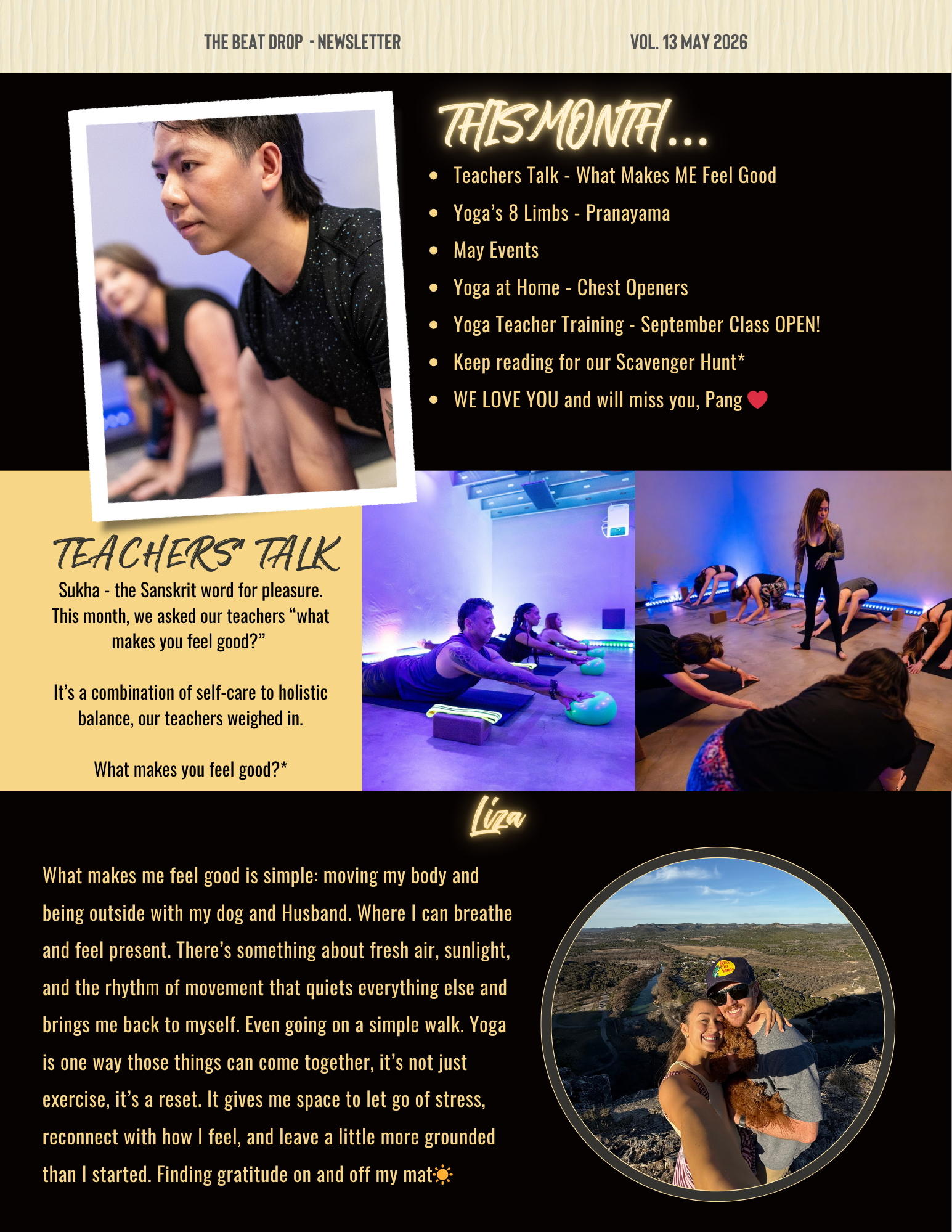 The Beat Drop - Newsletter Vol. 13 May 2026 This month Teachers Talk - What Makes ME Feel Good Yoga’s 8 Limbs - Pranayama May Events Yoga at Home - Chest Openers Yoga Teacher Training - September Class OPEN! Keep reading for our Scavenger Hunt* WE LOVE YOU and will miss you, Pang ❤️ Teachers Talk ukha - the Sanskrit word for pleasure. This month, we asked our teachers “what makes you feel good?” It’s a combination of self-care to holistic balance, our teachers weighed in. What makes you feel good?* Liza What makes me feel good is simple: moving my body and being outside with my dog and Husband. Where I can breathe and feel present. There’s something about fresh air, sunlight, and the rhythm of movement that quiets everything else and brings me back to myself. Even going on a simple walk. Yoga is one way those things can come together, it’s not just exercise, it’s a reset. It gives me space to let go of stress, reconnect with how I feel, and leave a little more grounded than I started. Finding gratitude on and off my mat☀️