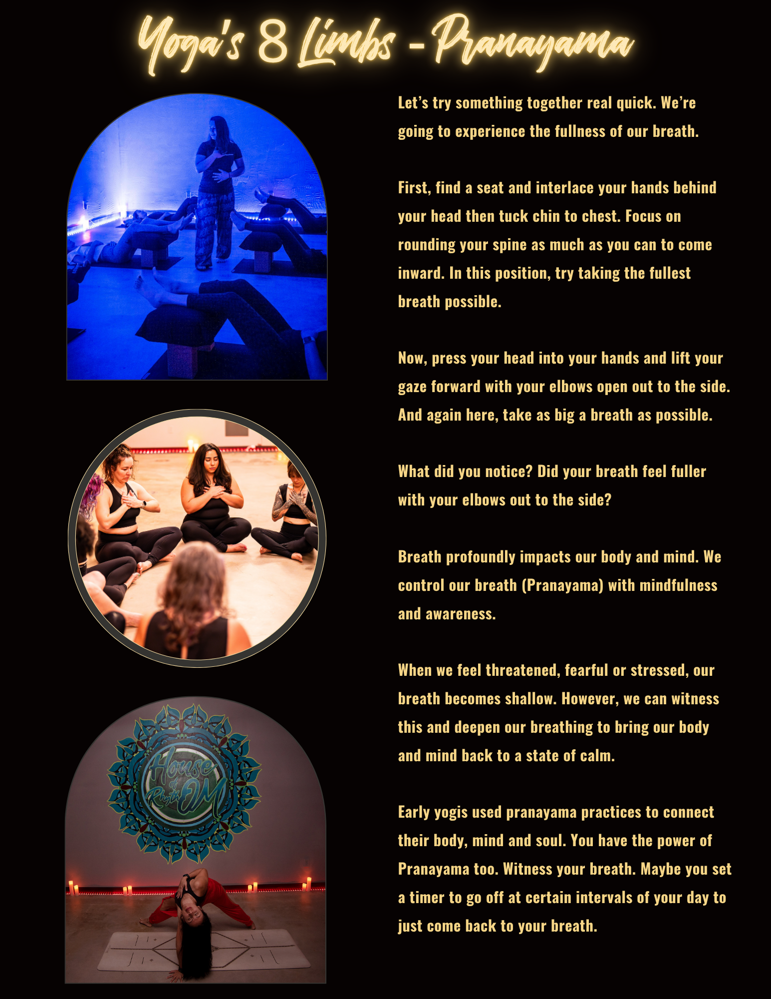 Yoga’s 8 Limbs - Pranayama Let’s try something together real quick. We’re going to experience the fullness of our breath. First, find a seat and interlace your hands behind your head then tuck chin to chest. Focus on rounding your spine as much as you can to come inward. In this position, try taking the fullest breath possible. Now, press your head into your hands and lift your gaze forward with your elbows open out to the side. And again here, take as big a breath as possible. What did you notice? Did your breath feel fuller with your elbows out to the side? Breath profoundly impacts our body and mind. We control our breath (Pranayama) with mindfulness and awareness. When we feel threatened, fearful or stressed, our breath becomes shallow. However, we can witness this and deepen our breathing to bring our body and mind back to a state of calm. Early yogis used pranayama practices to connect their body, mind and soul. You have the power of Pranayama too. Witness your breath. Maybe you set a timer to go off at certain intervals of your day to just come back to your breath.