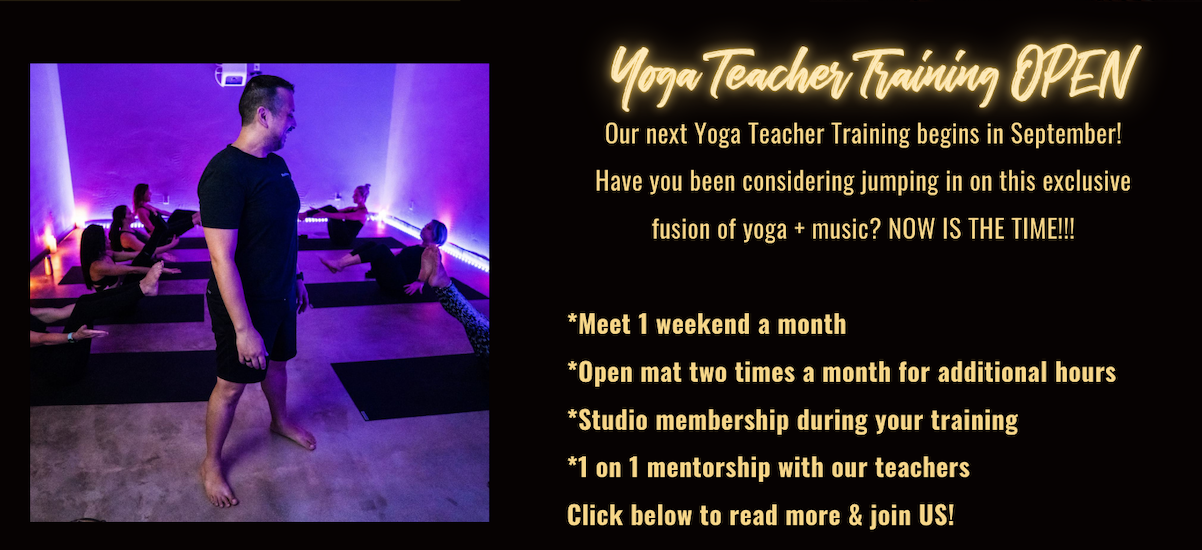 Yoga Teacher Training OPEN Our next Yoga Teacher Training begins in September! Have you been considering jumping in on this exclusive fusion of yoga + music? NOW IS THE TIME!!! *Meet 1 weekend a month *Open mat two times a month for additional hours *Studio membership during your training *1 on 1 mentorship with our teachers Click below to read more & join US!