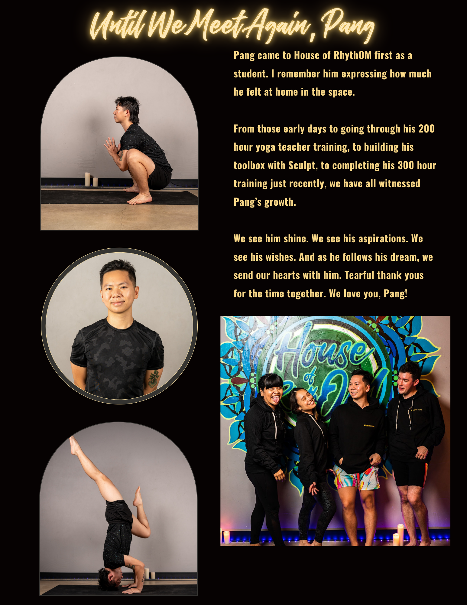 Until we meet again, Pang ng came to House of RhythOM first as a student. I remember him expressing how much he felt at home in the space. From those early days to going through his 200 hour yoga teacher training, to building his toolbox with Sculpt, to completing his 300 hour training just recently, we have all witnessed Pang’s growth. We see him shine. We see his aspirations. We see his wishes. And as he follows his dream, we send our hearts with him. Tearful thank yous for the time together. We love you, Pang!