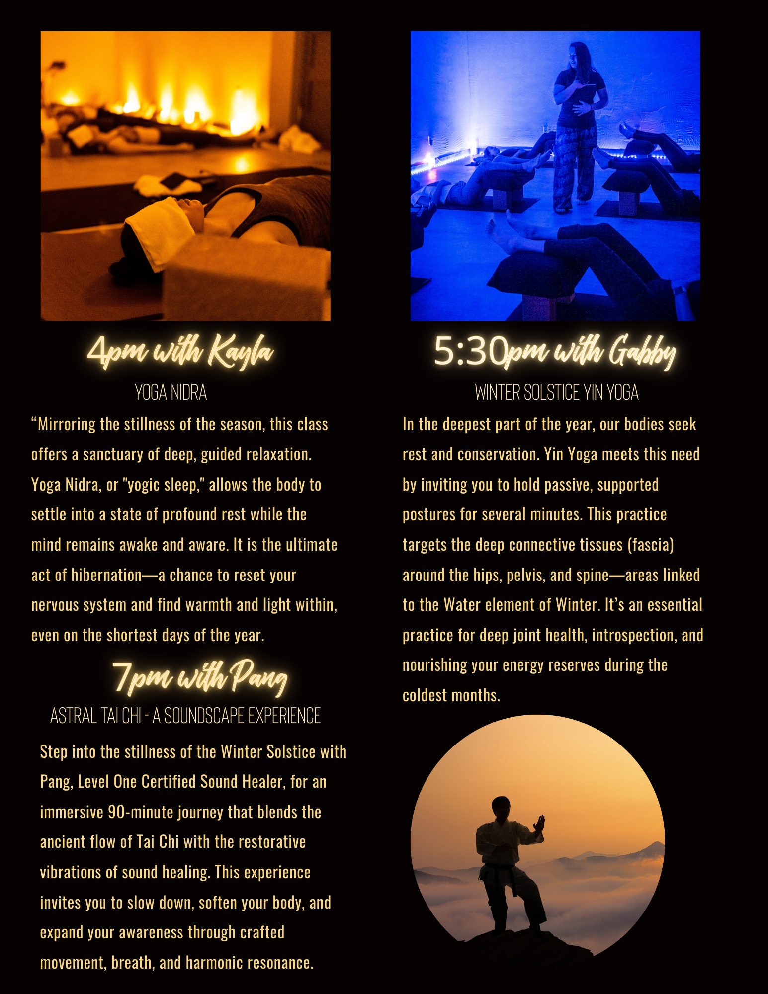 4pm with Kayla Yoga nidra “Mirroring the stillness of the season, this class offers a sanctuary of deep, guided relaxation. Yoga Nidra, or "yogic sleep," allows the body to settle into a state of profound rest while the mind remains awake and aware. It is the ultimate act of hibernation—a chance to reset your nervous system and find warmth and light within, even on the shortest days of the year. 5:30pm with Gabby Winter Solstice Yin Yoga In the deepest part of the year, our bodies seek rest and conservation. Yin Yoga meets this need by inviting you to hold passive, supported postures for several minutes. This practice targets the deep connective tissues (fascia) around the hips, pelvis, and spine—areas linked to the Water element of Winter. It’s an essential practice for deep joint health, introspection, and nourishing your energy reserves during the coldest months. 7pm with Pang Astral tai chi - a soundscape experience Step into the stillness of the Winter Solstice with Pang, Level One Certified Sound Healer, for an immersive 90-minute journey that blends the ancient flow of Tai Chi with the restorative vibrations of sound healing. This experience invites you to slow down, soften your body, and expand your awareness through crafted movement, breath, and harmonic resonance.