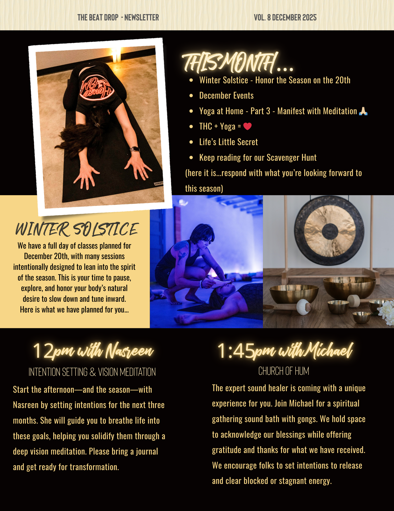 The Beat Drop - Newsletter Vol. 8 December 2025 this month... • Winter Solstice - Honor the Season on the 20th December Events Yoga at Home - Part 3 - Manifest with Meditation 🙏🏼 THC + Yoga = ❤️ Life’s Little Secret Keep reading for our Scavenger Hunt (here it is...respond with what you’re looking forward to this season) Winter Solstice e have a full day of classes planned for December 20th, with many sessions intentionally designed to lean into the spirit of the season. This is your time to pause, explore, and honor your body’s natural desire to slow down and tune inward. Here is what we have planned for you...12pm with Nasreen intention setting & Vision meditation Start the afternoon—and the season—with Nasreen by setting intentions for the next three months. She will guide you to breathe life into these goals, helping you solidify them through a deep vision meditation. Please bring a journal and get ready for transformation.1:45pm with Michael Church of hum The expert sound healer is coming with a unique experience for you. Join Michael for a spiritual gathering sound bath with gongs. We hold space to acknowledge our blessings while offering gratitude and thanks for what we have received.We encourage folks to set intentions to release and clear blocked or stagnant energy.