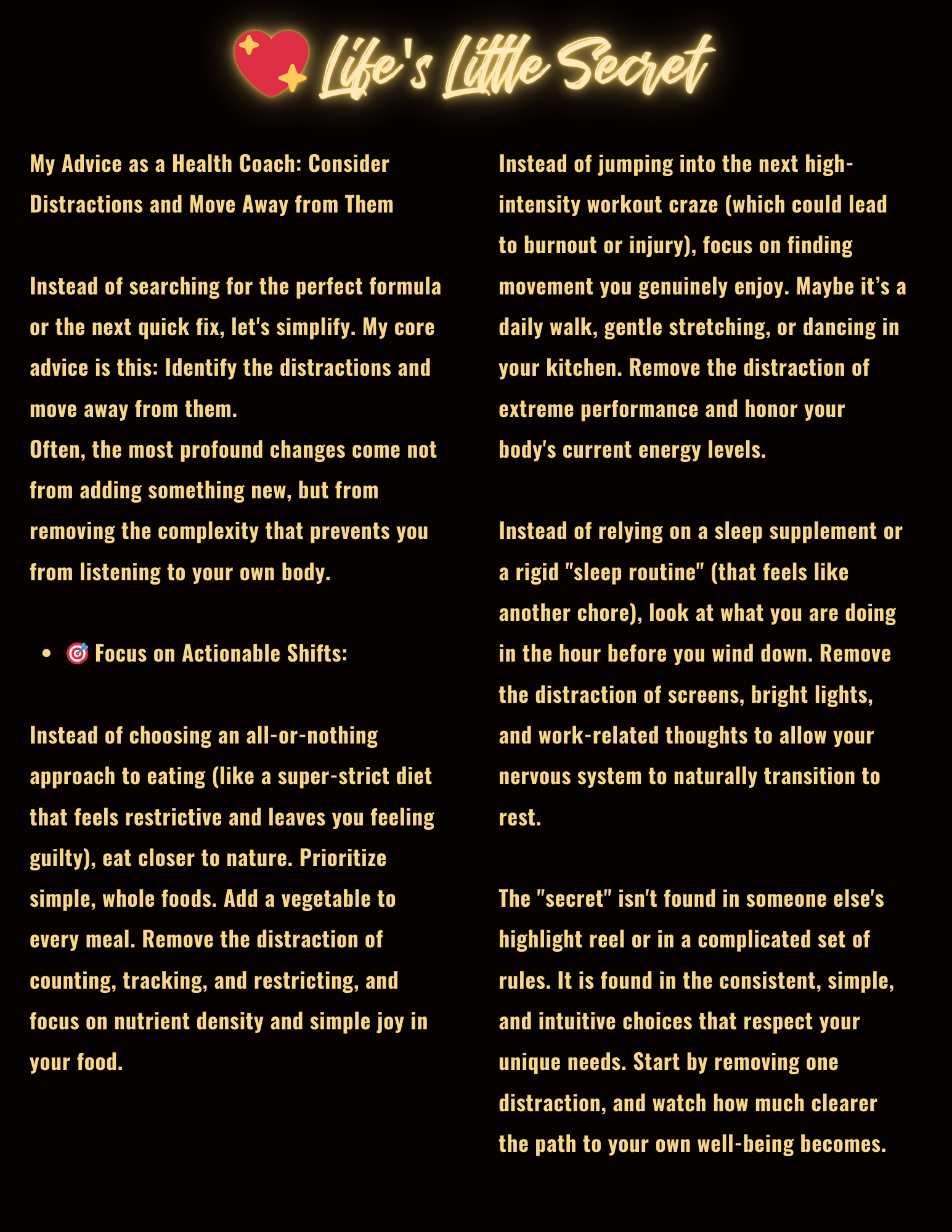 My Advice as a Health Coach: Consider Distractions and Move Away from Them Instead of searching for the perfect formula or the next quick fix, let's simplify. My core advice is this: Identify the distractions and move away from them. Often, the most profound changes come not from adding something new, but from removing the complexity that prevents you from listening to your own body. 🎯 Focus on Actionable Shifts: Instead of choosing an all-or-nothing approach to eating (like a super-strict diet that feels restrictive and leaves you feeling guilty), eat closer to nature. Prioritize simple, whole foods. Add a vegetable to every meal. Remove the distraction of counting, tracking, and restricting, and focus on nutrient density and simple joy in your food. Instead of jumping into the next high-intensity workout craze (which could lead to burnout or injury), focus on finding movement you genuinely enjoy. Maybe it’s a daily walk, gentle stretching, or dancing in your kitchen. Remove the distraction of extreme performance and honor your body's current energy levels. Instead of relying on a sleep supplement or a rigid "sleep routine" (that feels like another chore), look at what you are doing in the hour before you wind down. Remove the distraction of screens, bright lights, and work-related thoughts to allow your nervous system to naturally transition to rest. The "secret" isn't found in someone else's highlight reel or in a complicated set of rules. It is found in the consistent, simple, and intuitive choices that respect your unique needs. Start by removing one distraction, and watch how much clearer the path to your own well-being becomes.