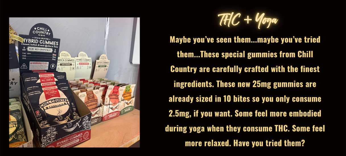 THC + Yoga Maybe you’ve seen them...maybe you’ve tried them...These special gummies from Chill Country are carefully crafted with the finest ingredients. These new 25mg gummies are already sized in 10 bites so you only consume 2.5mg, if you want. Some feel more embodied during yoga when they consume THC. Some feel more relaxed. Have you tried them?