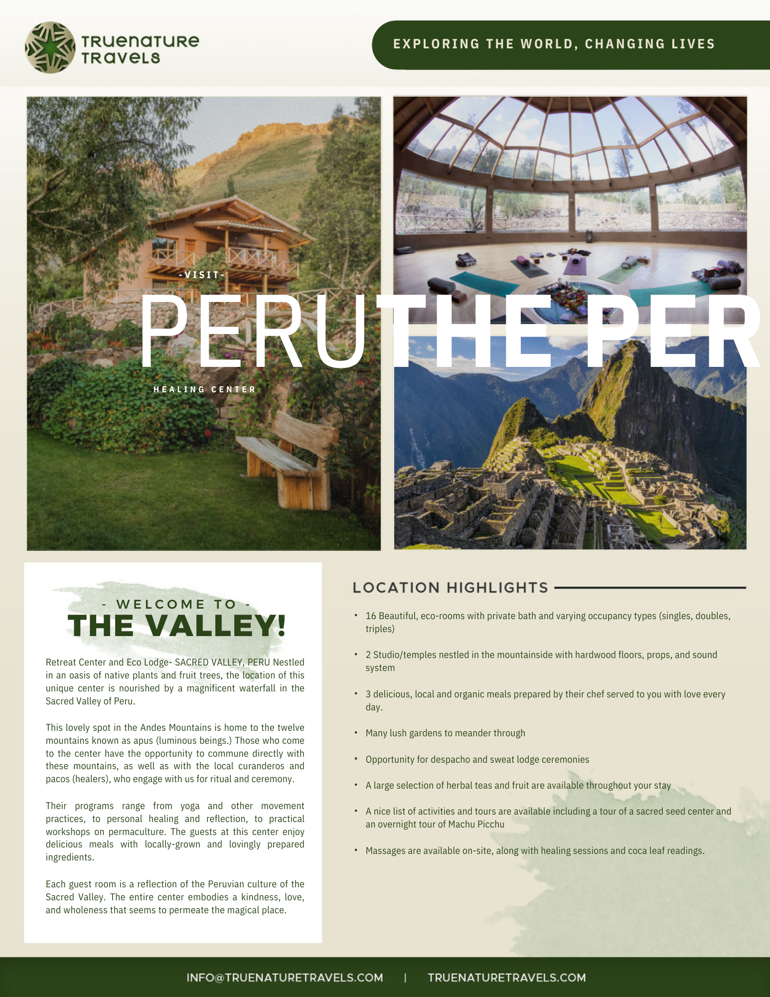 Peru Here we come Imagine stepping away from the noise of the ordinary and into a land where time slows down. Picture yourself immersed in daily practice amidst the peaks of Peru, allowing every breath and every movement to unfold with pure intention. Join us April 30 – May 6, 2027, for a transformative journey into the heart of the Andes. Your Experience Includes: Daily Practice: Invigorating Yoga (multiple sessions daily), Meditation, and restorative Yoga Nidra. Mindful Exploration: Silent hiking through sacred landscapes and excursions to the ancient wonders of Machu Picchu. Purposeful Connection: Dedicated time in service to the local community and the chance to forge lifelong friendships. Restoration: Rejuvenating spa treatments and space for quiet reflection. *Register NOW (January 1st through 14th) for Feel the OM: Sacred Valley Immersion and receive an additional $200 off using code: EXPLORE26 at checkout. When combined with our Early Bird Special, get a total of up to $500 OFF!!!* Payment plans are available. Register using the link below and read on for more information about the location.